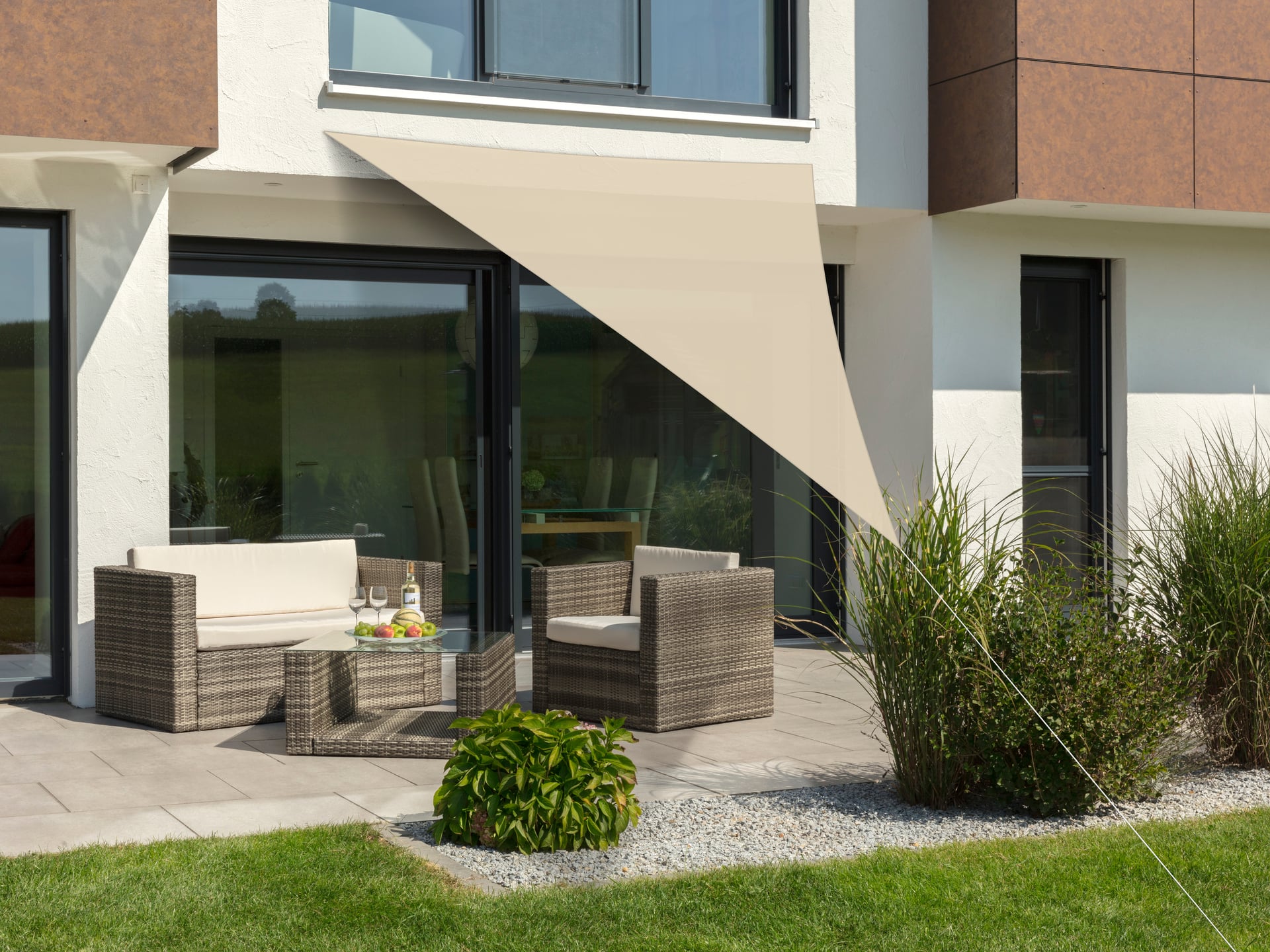 Die Kantenlänge des gleichschenkligen Sonnensegels beträgt jeweils ca. 360 cm, 300 cm oder 400 cm und ist damit ideal um eine größere Sitzecke zu beschatten. Gleichzeitig wird Ihnen ein UV-Schutz von ca. 50 % geboten.