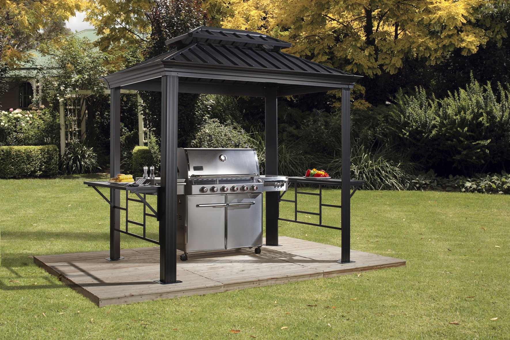 Der wesentliche Unterschied zu anderen Pavillons liegt im Material des Daches. Hier wird anstelle von Kunststoffplatten oder Stoff langlebiger und ständig formschöner Stahl verwendet.