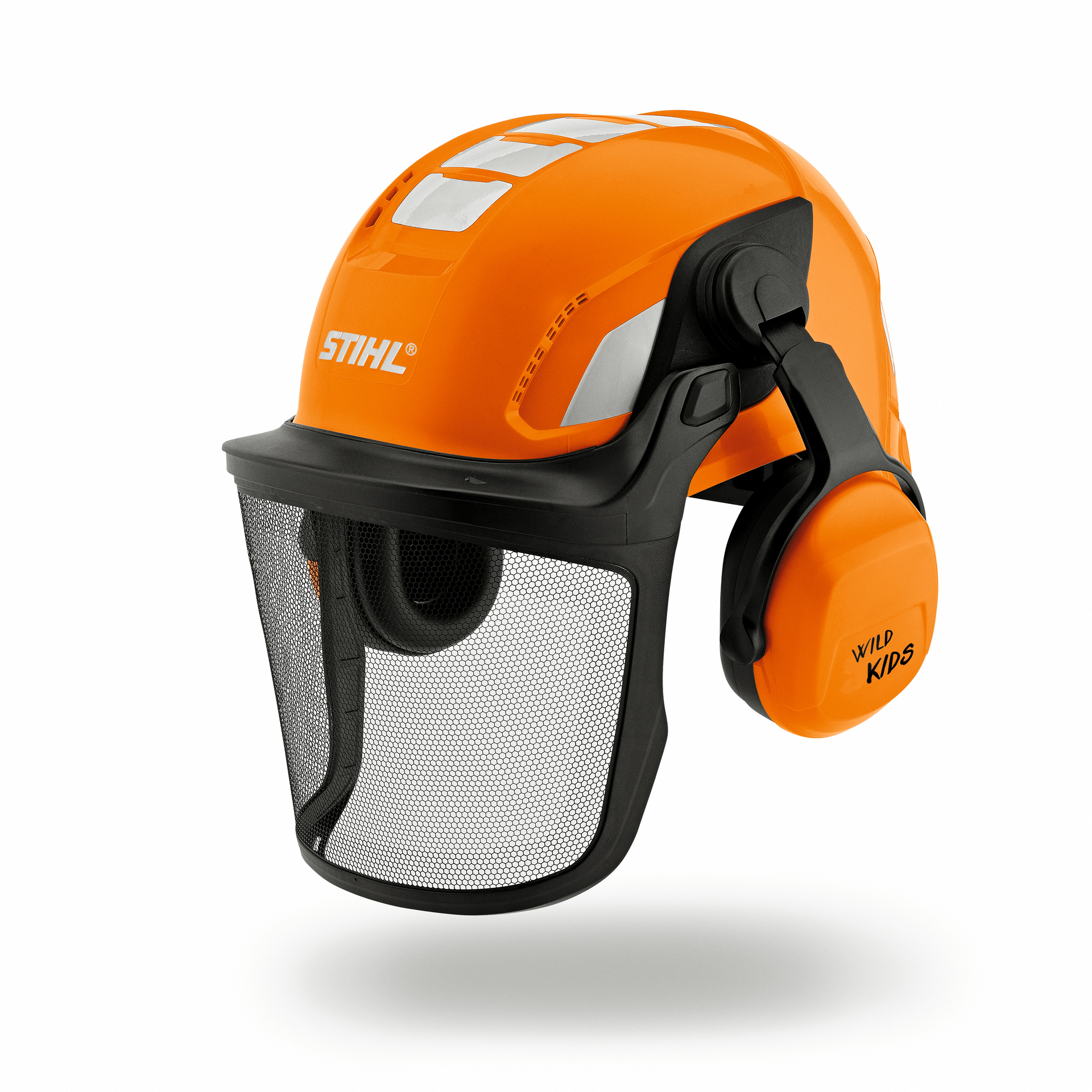 Originalgetreue Nachbildung des STIHL Profihelms, ABS-Kunststoff, klappbares Visier, verstellbare Größe, anklappbarer Ohrschutz, keine Schutzfunktion, für Kinder ab 3 Jahren geeignet.