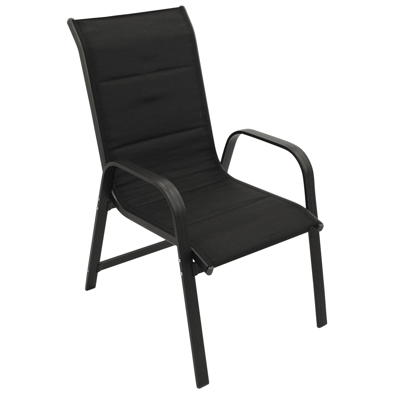 Stapelsessel Hochlehner mit Gestell aus Aluminium dunkelgrau, Bespannung Textilgewebe schwarz mit eingearbeiteter Polsterung, 2 Stück.
