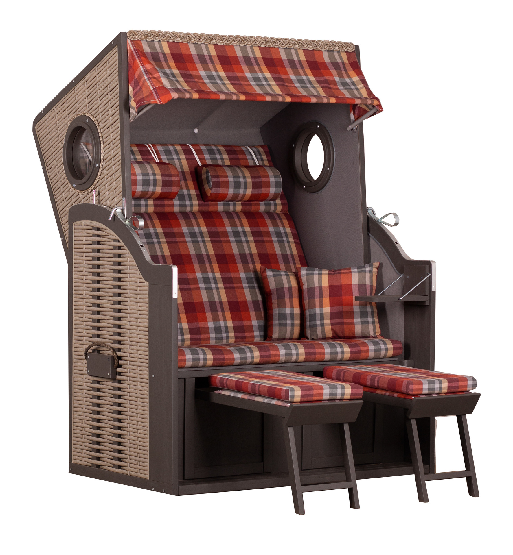 Die Kissenausstattung inkl. zwei Knuffelkissen im Karo-Design sowie die höhenverstellbaren Fußstützen mit Teleskopauszug und der verstellbare Oberkorb bieten hohen Komfort und laden zum langen Verweilen ein.