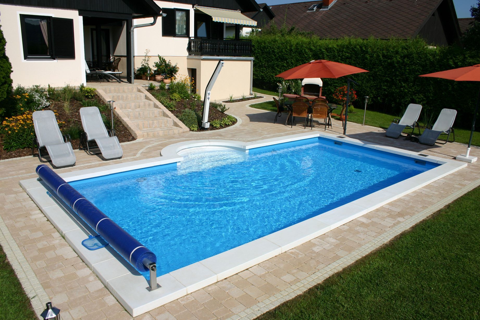 Erhältlich wahlweise mit Tiefbeckenleiter oder Römertreppe.