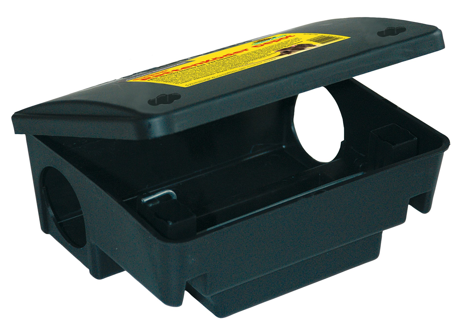 Die wiederverwendbare Köderbox aus Kunststoff ist mit einem kindersicheren Verschluss versehen. Eine Metallstange im Inneren der Box hält die Köder sicher am Platz. Ein Verschleppen des Giftköders außerhalb des Depots wird so vermieden.