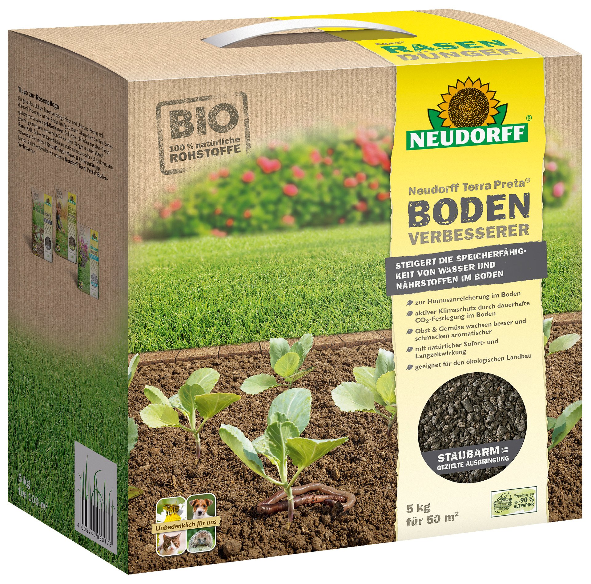 Der Neudorff Terra Preta BodenVerbesserer ist ein organisch-mineralischer NPK- Dünger, der für alle Böden und Kulturen geeignet ist. Die Inhaltsstoffe Bio-Pflanzenkohle, organisches Material und Mikroorganismen sorgen für einen aktiven Humusaufbau, der den Boden nachhaltig verbessert. Das staubarme Granulat ermöglicht zielgerechte Ausbringung mit dem Streuwagen oder per Hand. Unbedenklich für Haustiere, Nützlinge und Menschen.