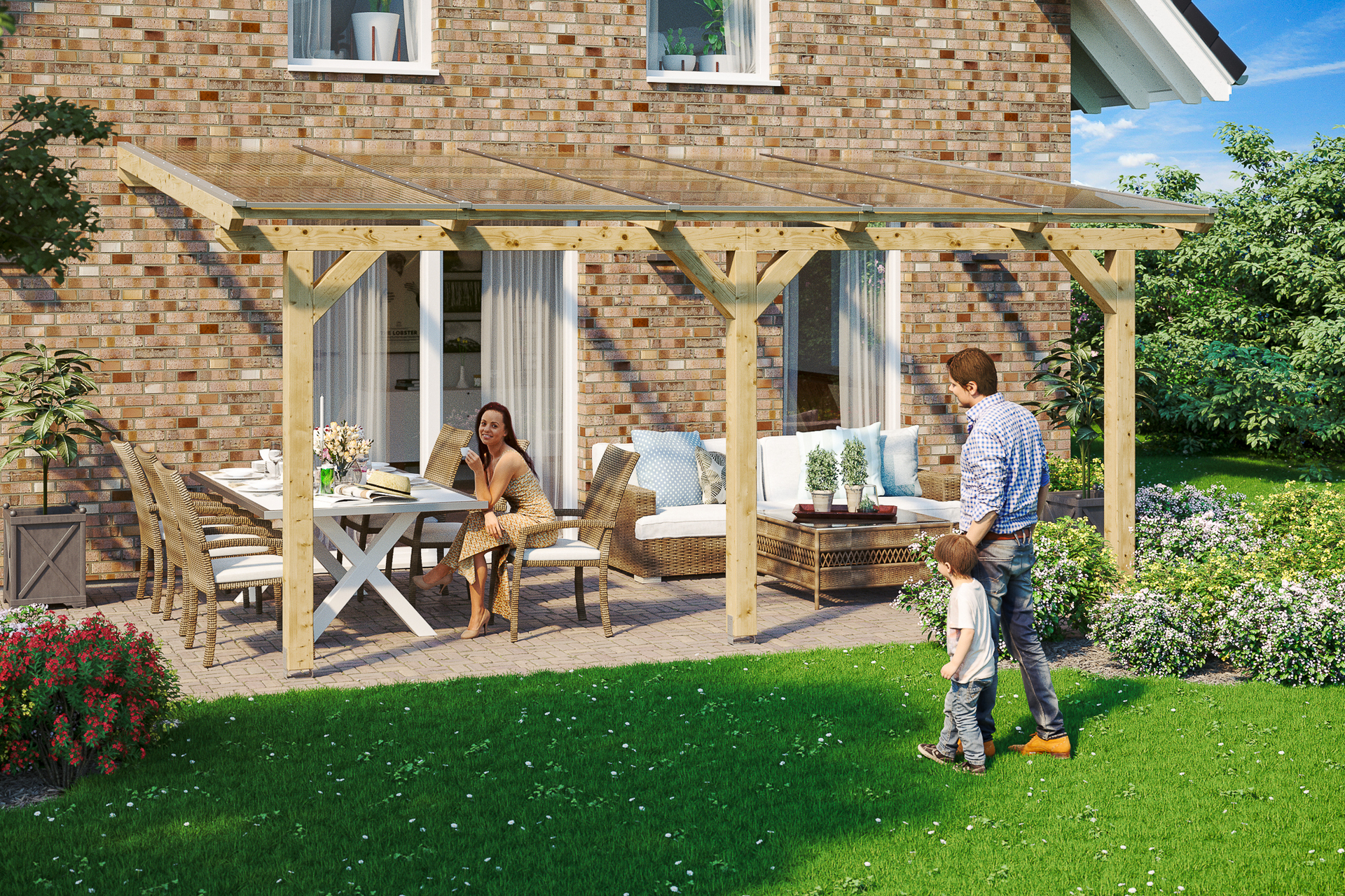 Die Dacheindeckung besteht aus stabilen, 16 mm dicken Polycarbonat Doppelstegplatten. Die Oberseite ist mit einer UV-reflektierenden Schicht versehen. Befestigt werden diese durch hochwertige Aluminium-Profile mit EPDM-Lippendichtungen.