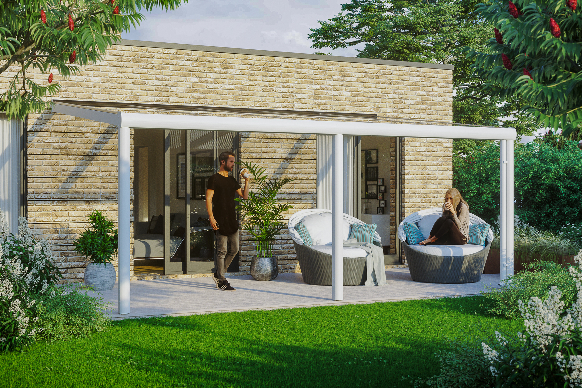 Die Dacheindeckung besteht aus stabilen, 16 mm dicken Polycarbonat Doppelstegplatten. Die Oberseite ist mit einer UV-reflektierenden Schicht versehen. Befestigt werden diese durch hochwertige Aluminium-Profile mit EPDM-Lippendichtungen.