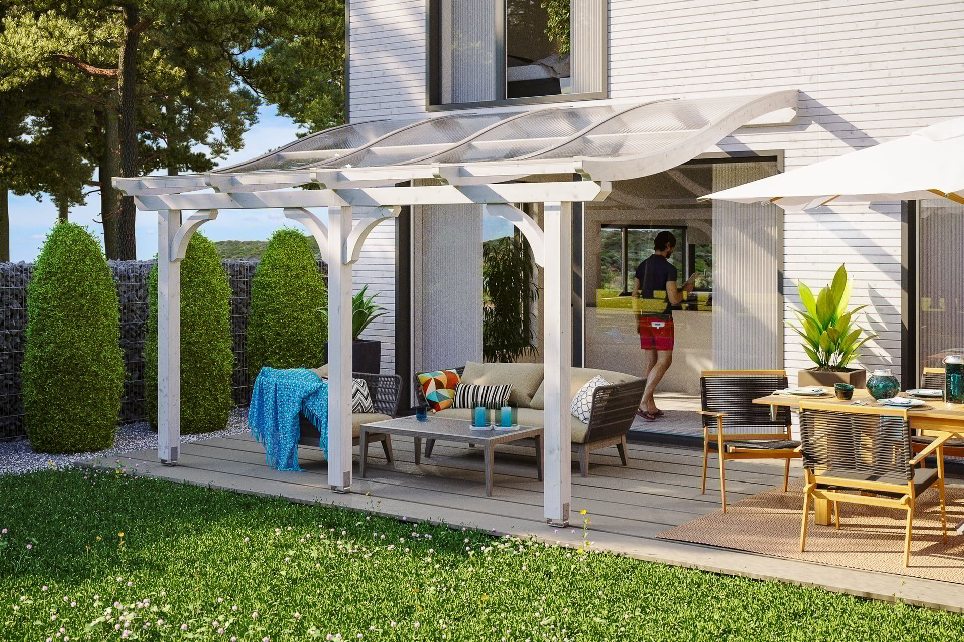 Die Dacheindeckung besteht aus stabilen, 10 mm dicken Polycarbonat Doppelstegplatten. Die Oberseite ist mit einer UV-reflektierenden Schicht versehen. Befestigt werden diese durch hochwertige Aluminium-Profile mit EPDM-Lippendichtungen.