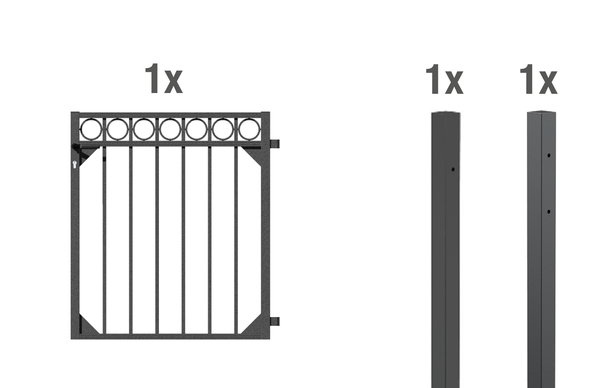 1 Anschlagpfosten Chaussee, Circle, Aluminium, anthrazit, zum Einbetonieren60x60/1700, 1 Klobenpfosten Chaussee, Circle, Aluminium, anthrazit, zum Einbetonieren60x60/1700, 1 EinzeltorCircle, ohne Pfosten, Aluminium, anthrazit, 965×1200