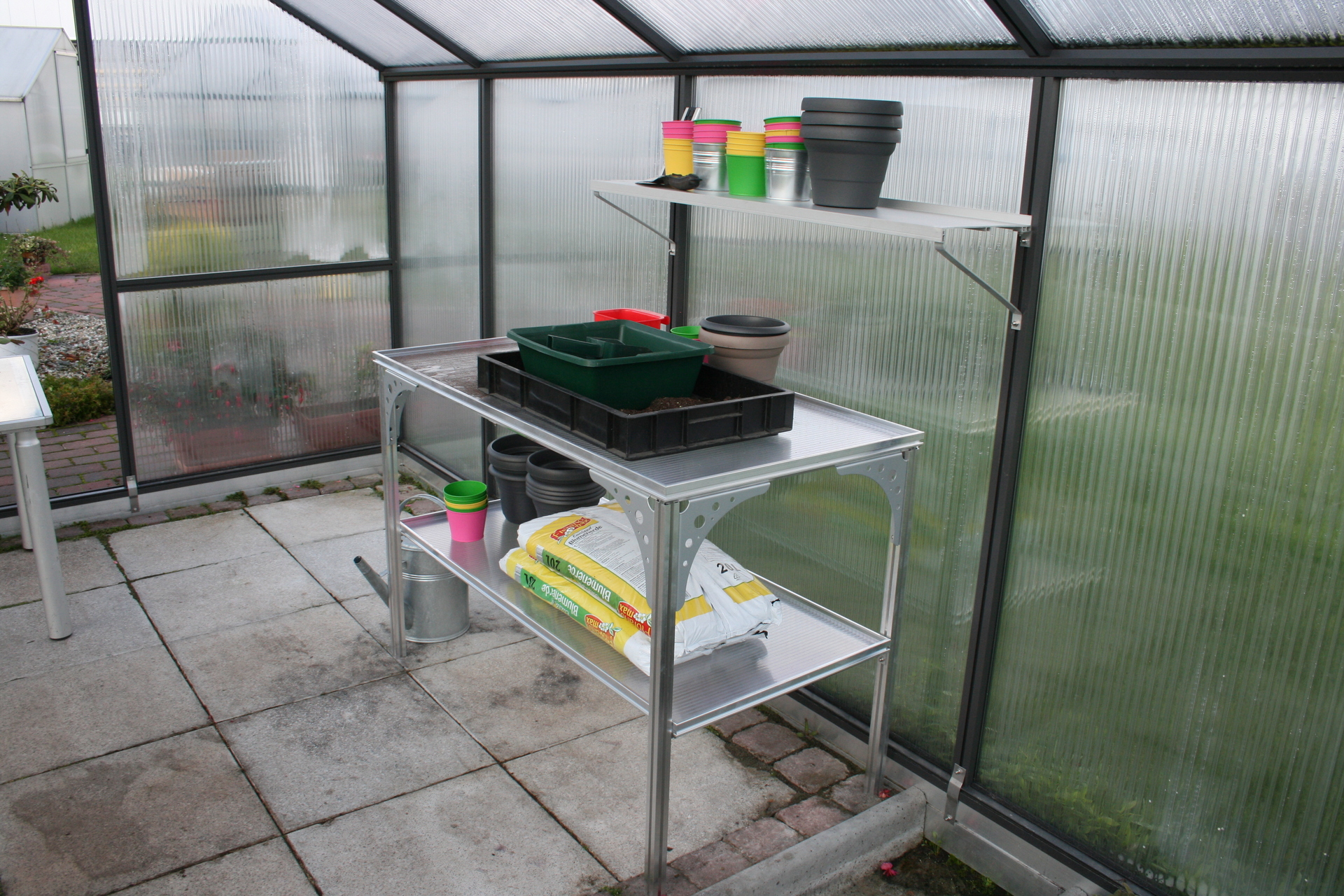 Der Universal Aluminium Tisch mit zwei Arbeitsplatten aus Kunststoff sorgt für mehr Arbeits- und Ablagefläche in Ihrem Gewächshaus. Mit den Abmessungen 1,21 x 0,64 x 0,80 m (BxTxH) ist angenehmes Gärtnern gewährleistet. Der Tisch ist für verschiedene Gewächshaustypen geeignet.
