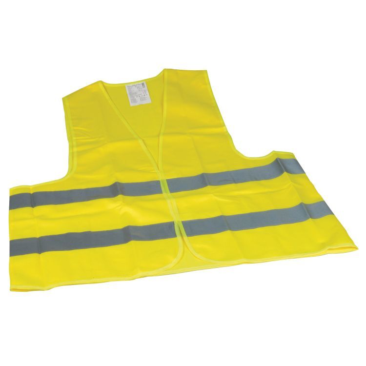 Warnweste aus Polyester mit zwei fluoreszierenden Reflexstreifen rundum am Saum.