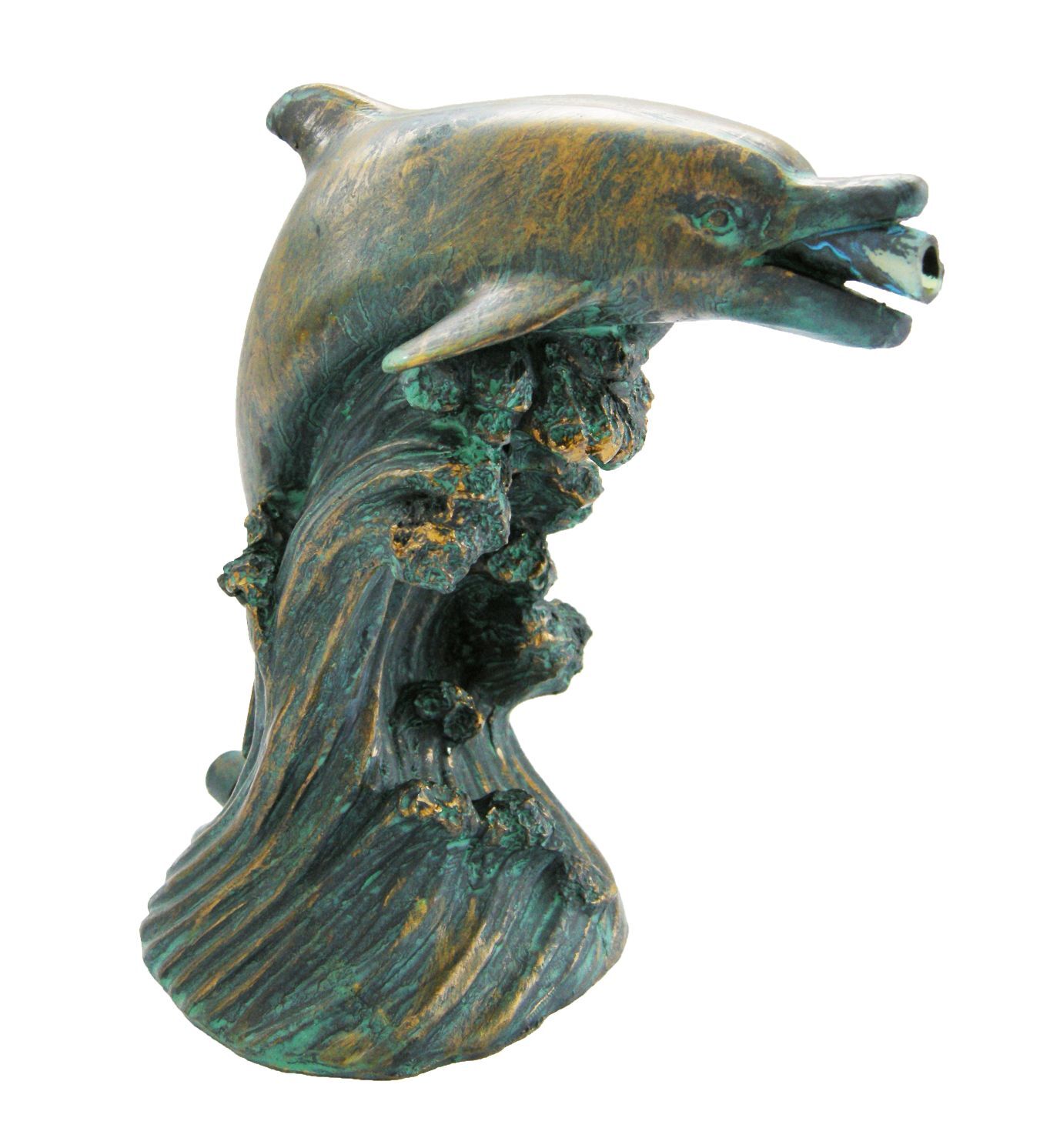 Wasserspeier in Form eines Delfines. Material: Polyresin, kupfergrün