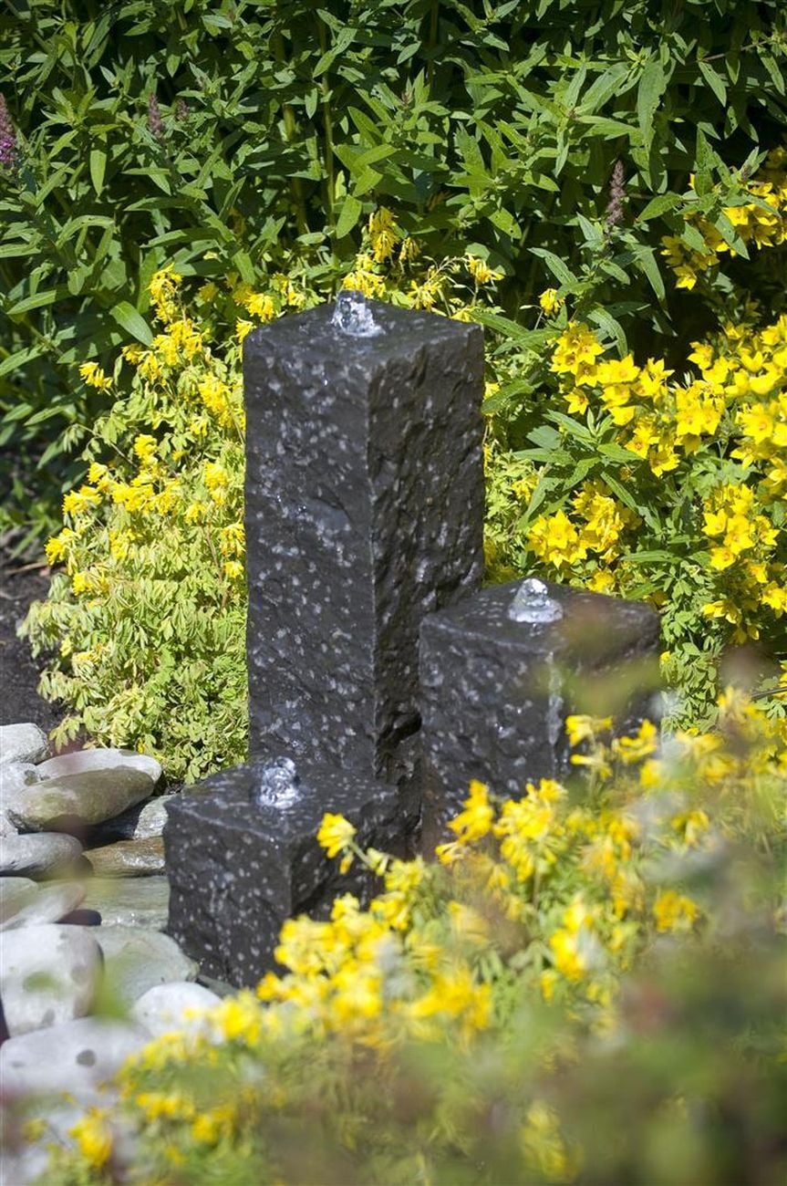 3 Granitsäulen als Wasserspiel, Komplettset mit Pumpe, Becken, Abdeckplatte und Anschlussmaterial