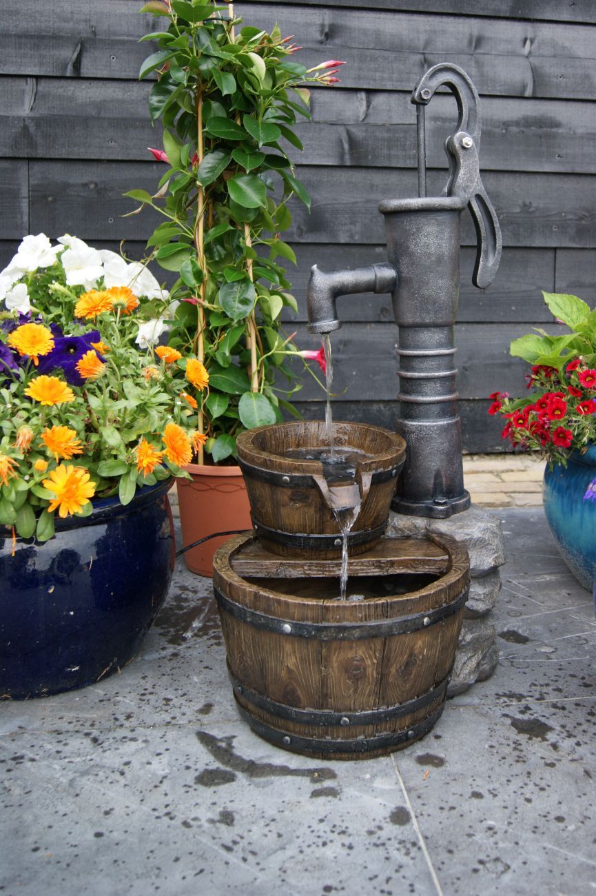 Dekobrunnen, rustikale Dekoration „Schwengelpumpe mit Fässern“ für den Garten und die Terrasse, komplett mit Pumpe, sofort einsatzbereit, mit eigenem Wasserreservoir,