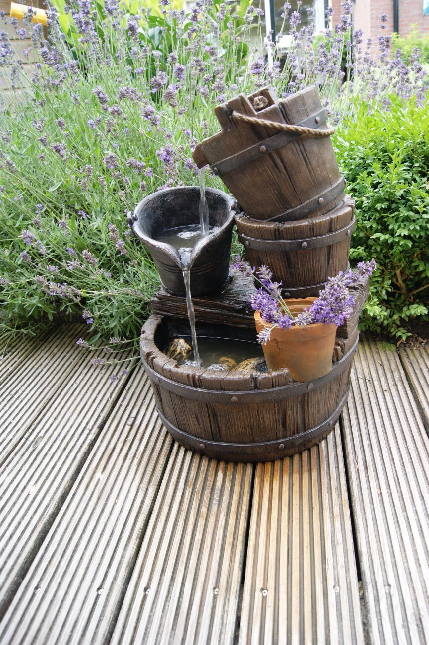 Dekobrunnen, rustikale Dekoration „Fässer und Eimer“ für den Garten und die Terrasse, komplett mit Pumpe, sofort einsatzbereit, mit eigenem Wasserreservoir,