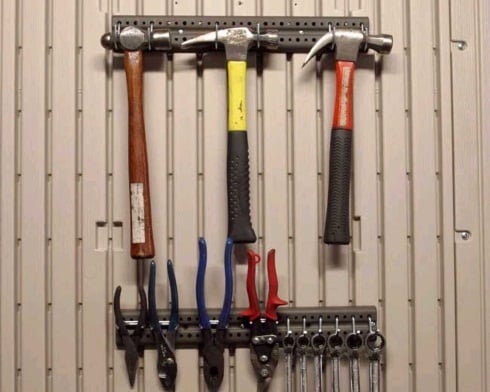 An den praktischen Werkzeughalteleisten können Werkzeuge und Gartenutensilien platzsparend befestigt werden, was das lange Suchen von Kleinteilen vermeidet. Die mitgelieferten Metallhaken (10 Stk.) sind variable einsetzbar.