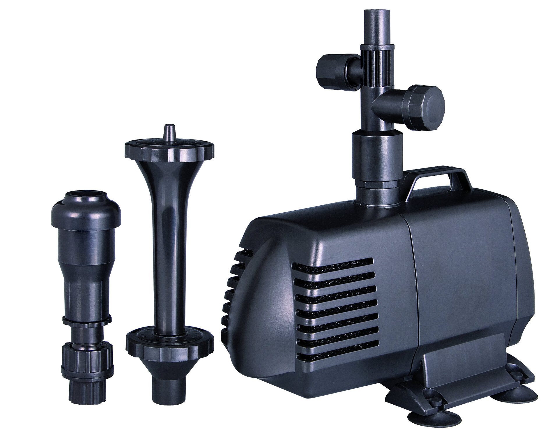 Teichpumpen für Wasserfontänen und Wasserspiele, es gibt sie in verschiedenen Leistungsstufen, sie werden je nach Typ mit einem oder zwei Düsenaufsätzen geliefert.