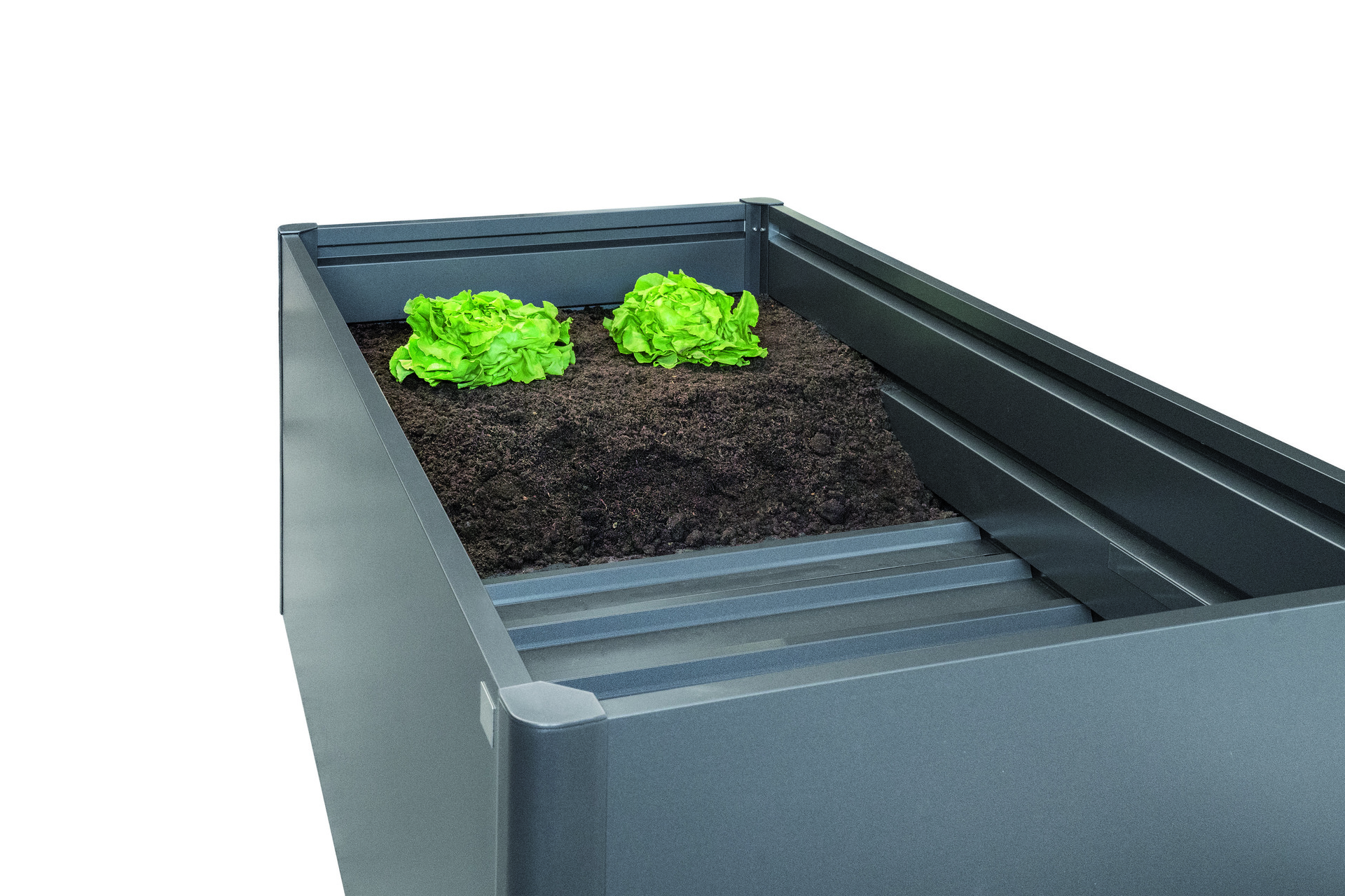 Der Zwischenboden reduziert das Erdvolumen, spart teures Befüllungsmaterial und wertvolle Zeit. Er wird beim Aufbau einfach auf die zweite Sicke von oben aufgelegt. Um den Wasserablauf zu gewährleisten und Staunässe zu vermeiden, ist der Zwischenboden nicht wasserdicht.